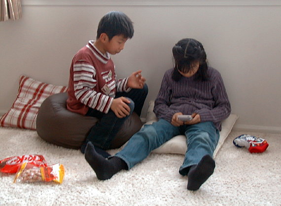 In Japanese: We both tried to confuse each other with weird attributes of our native language. It was fun. Mitsue-san said that Takashi-san would be home later, and that he was much better with English and "teaching" things than she was. (Her English was still much more advanced than my Japanese.) I still had lots of fun and learned many things from talking with Mitsue-san. Before Takashi-san got home, the kids showed me their Nintendo Game Boy and games. They were excited that I said "Watashi wa, bideo geemu ga suki desu" (I like video games). The two particulars they were playing (if you're interested) were a Kirby title and a Mario title (two characters whose scope extends far beyond the video game circle in Japan especially and also somewhat in America). I tried to play for a little while, but not having practiced those games, I didn't do all that great. I mentioned to them, "Watashi no kompyuta ni, Mario geemu ga arimasu." (On my computer I have a Mario game.) That got them all excited. This statement would have an effect on the second day. PHOTO: Shuu-chan and Sana-chan playing a video game on the Nintendo Game Boy. |