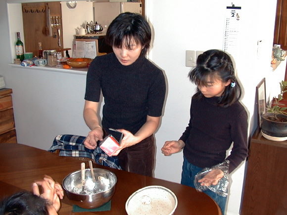 PHOTO: Mitsue-san demonstrating how to make onigiri rice balls. We made three different kinds, and didn't use seaweed. By the time I was done with that, the pie timer had sounded, and I rushed over to see what had resulted. Hmmm... still looked rather raw. I asked Takashi-san to set the timer for 10 more minutes (he asked me "Chotto, mo sukoshi?" (not quite, a little more?)), and in the mean time watched everyone bustle about (helping a little here and there). After 10 minutes? Ehh... maybe 5 more minutes. After 5 more minutes? Hmmm... maybe it's more raw than I thought! Try... 7 more minutes (by this time I had learned how to use the oven myself!). After 7 more minutes? Sheesh! How long is it going to take? Try another 10 more minutes! After that? I think it's done! Nice and golden brown. Lessons learned: When baking with a convection oven and converting to celcius, round up, not down. When baking with a small convection oven, bake for a little longer. By this point in the day, the kids had already asked me 3 or 4 times if they could play my Mario video game on the computer. We all decided we'd make them wait until the party to play it. PHOTO: Shuu-chan playing with some toys instead. The Yamadas had set up two low tables with cushions on the floor in the living room area. The food for the party consisted of fruit salad, apple pie, pasta salad with a bit of turkey, Japanese "mikan" citrus fruits (similar to tangerines) and bananas, "onigiri" (rice balls with seasonings), rice crackers, and teriyaki-flavored sloppy joes. Beverages included coffee, some citrus soft drinks (like Sprite), and "mizu" (water). An interesting combination to say the least. The first two guests to arrive were two formers students of Takashi-san. He had taught English several years ago, and apparently had kept in touch with these two. I think they were in their first year of college. Their English was probably OK, but a little rusty, so they tended not to use more than a word or two of it at a time. I showed them pictures and maps of Michigan, and told them the unbelievable tale of how much snow falls in the U.P. (accompanied by a postcard with a picture of the "snowmometer" -- a giant sign similar to a thermometer that shows the current total snowfall for the year in the Michigan Tech area). By this time I was getting lots of practicing using Japanese to describe my postcards and pictures. LINK TO ANOTHER SITE: Keweenaw Snow Thermometer When I was just about finished describing all of my postcards, more guests arrived. I was completely surprised to hear the sound of high-speed, slurred, colloquial English being spoken. I had been speaking and hearing Japanese for the last 24 hours, and occasionally hearing or speaking very "textbook" English. Two guests had arrived who were Americans living in Japan. I think both were English teachers in Japanese schools. With them was a Japanese woman who also spoke English to some extent. We had a big ol' English party going on, in Japan, in a Japanese home. At first I felt completely uncomfortable using colloquial English with the two other Americans. My thought process was: "I'm in Japan. I'm here to learn Japanese. Most people in this room understand Japanese much more readily than they understand English. Speaking in colloquial English blocks out everyone else from understanding what we're saying." But it was so efficient! With a few mumbled noises and chopped off words, I could convey such complex information! (At this point I was used to "thinking" in grammatically simple manner to make it easier to communicate.) I still tried not to use English whenever possible. |