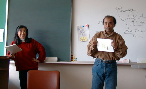 Class Picture 2 Sometimes class is interesting (Cousins-san, Cain-san, Proctor-san, Pitaniello-san), but if we all stayed up too late the previous night, sometimes it's not (Kennedy-san, Houbeck-san, Cousins-san). When we're sitting down, we listen to the sensei and answer questions fired at us (usually at the rate of about 5-6 questions per minute). Here's Yonezawa-sensei using one of her props "Howaito-san" (Mr. White) to teach us a certain grammar pattern. When the sensei want to reinforce something, they often call us to the front of the class to "act" out a certain part using Japanese (for example, a shopkeeper, customer, person waiting at a bus stop, taxi passenger, etc). Here's Miah-san holding an imaginary 500-yen item at the request of Melville-sensei.